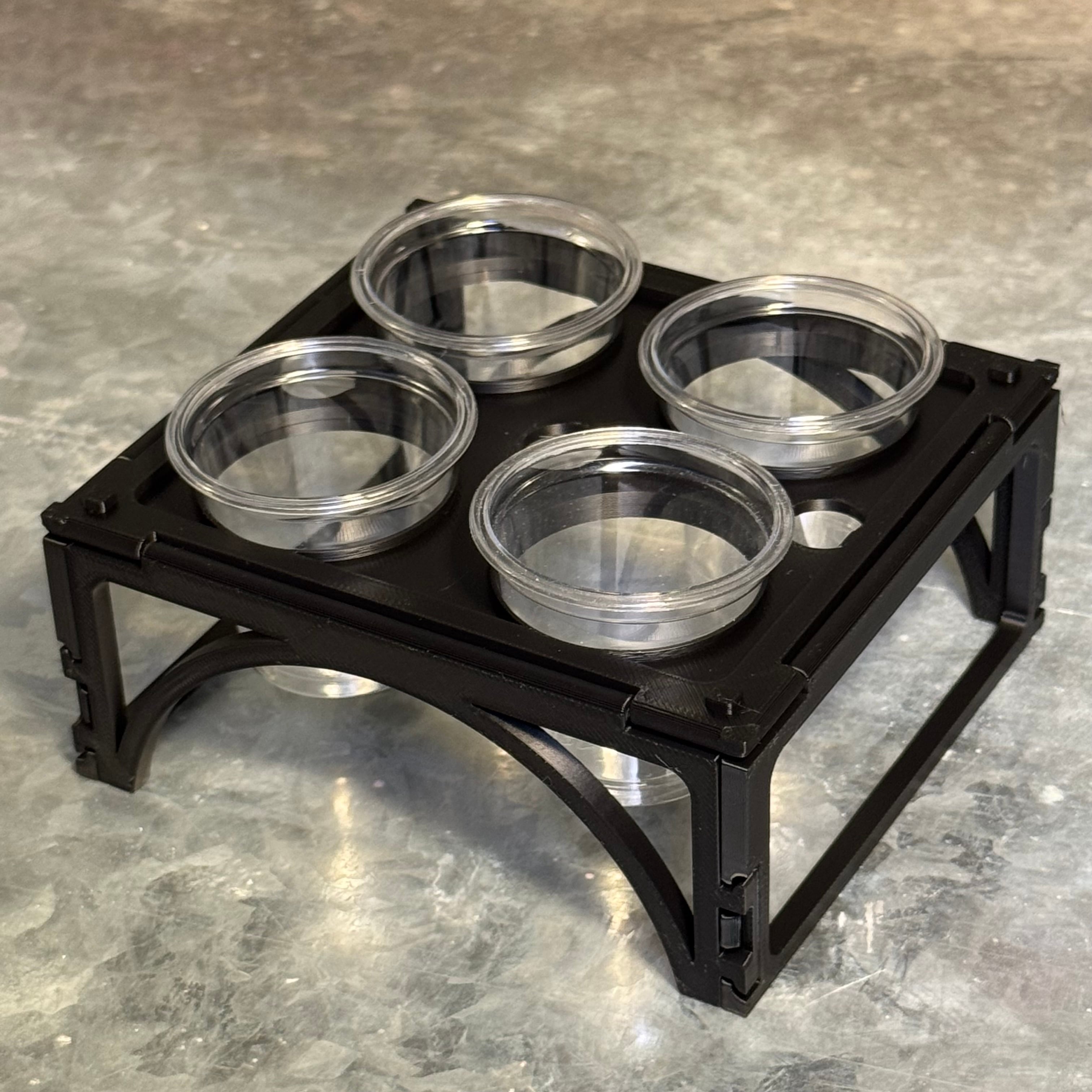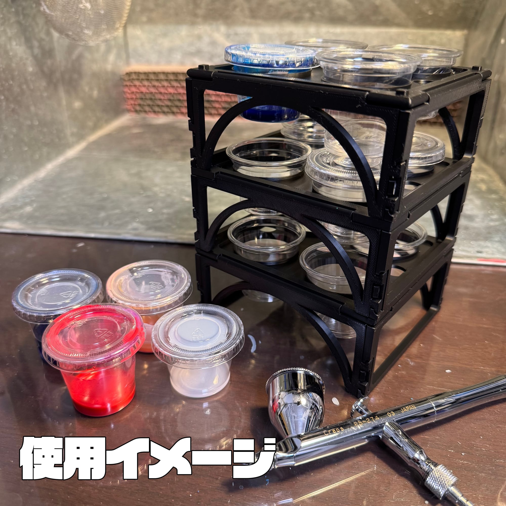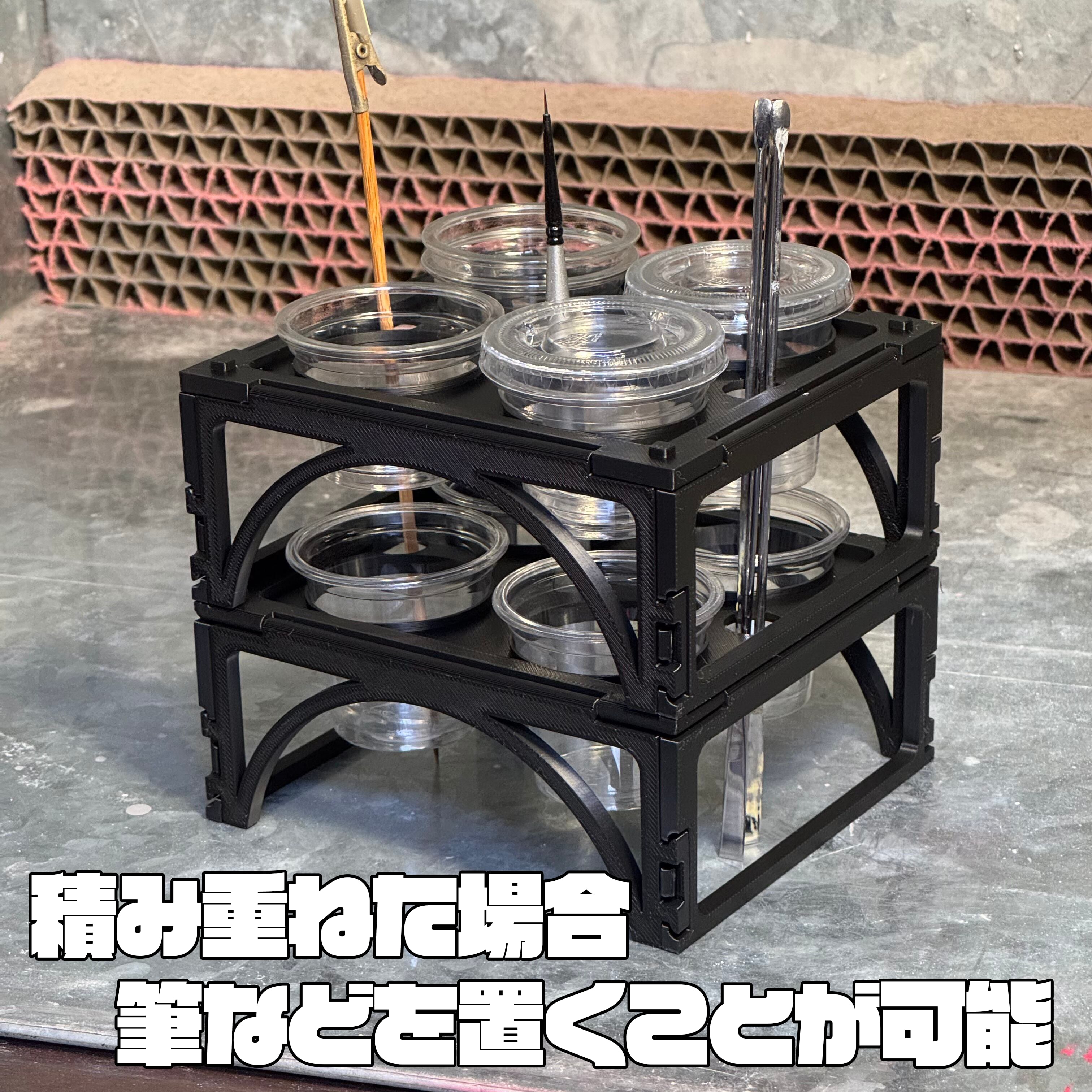 水性油性問わず塗料カップとして非常に便利な『HEIKOの1オンスPETカップ』を4個セットできる組み立て式のスタンドです。
